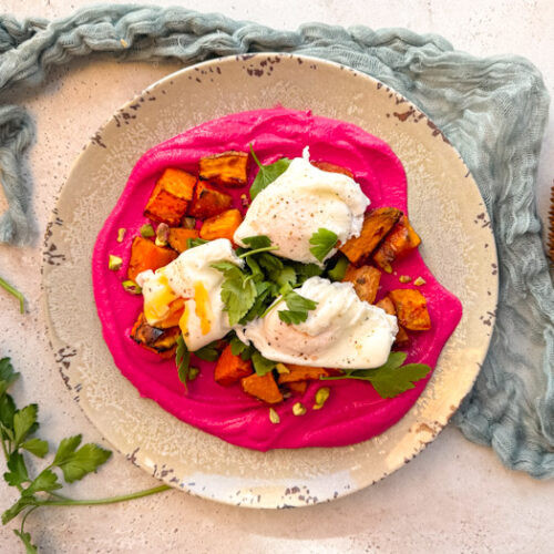 Deze geroosterde zoete aardappel met bietenhummus en gepocheerd ei is een fantastisch wintergerecht. Niet alleen is dit een ware traktatie voor je smaakpapillen, het is ook nog eens een kleurenfestijn op je bord. Het romige van de gepocheerde eieren, het zoetzure van de bietenhummus, de kruidige bite van de zoete aardappel en het heerlijke lopende eidooiertje maken dit een waar topgerecht.