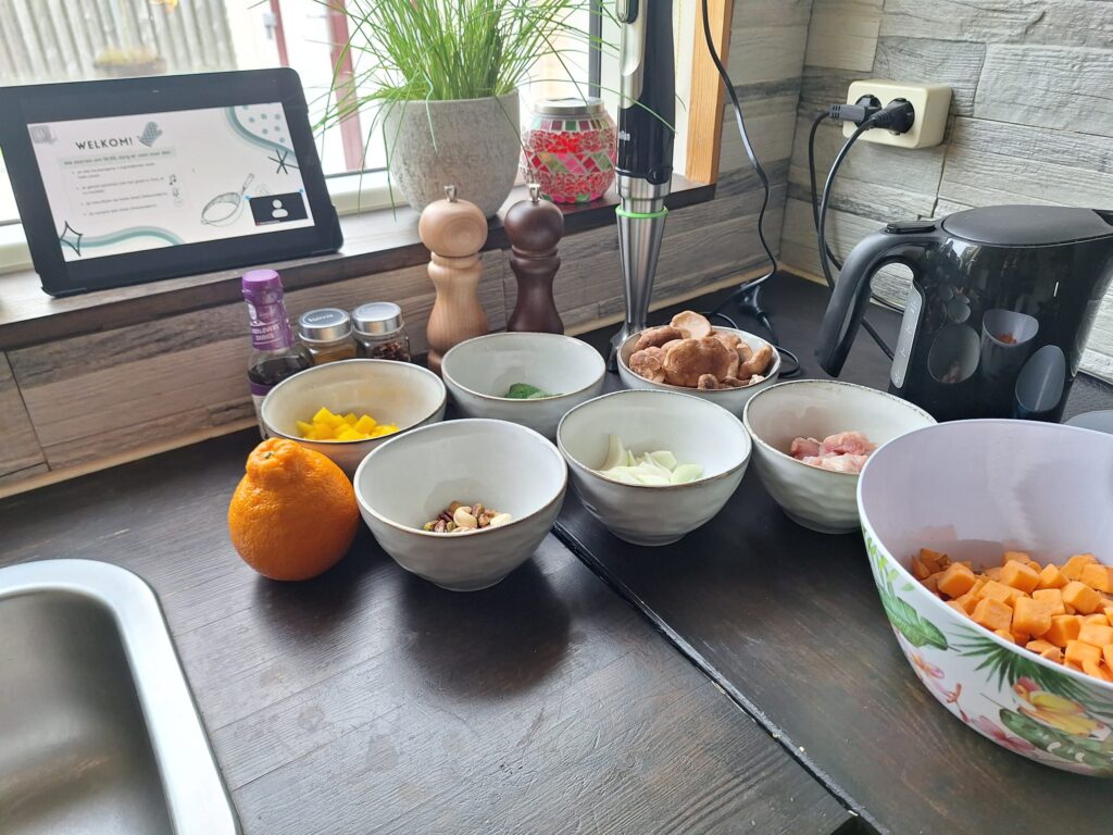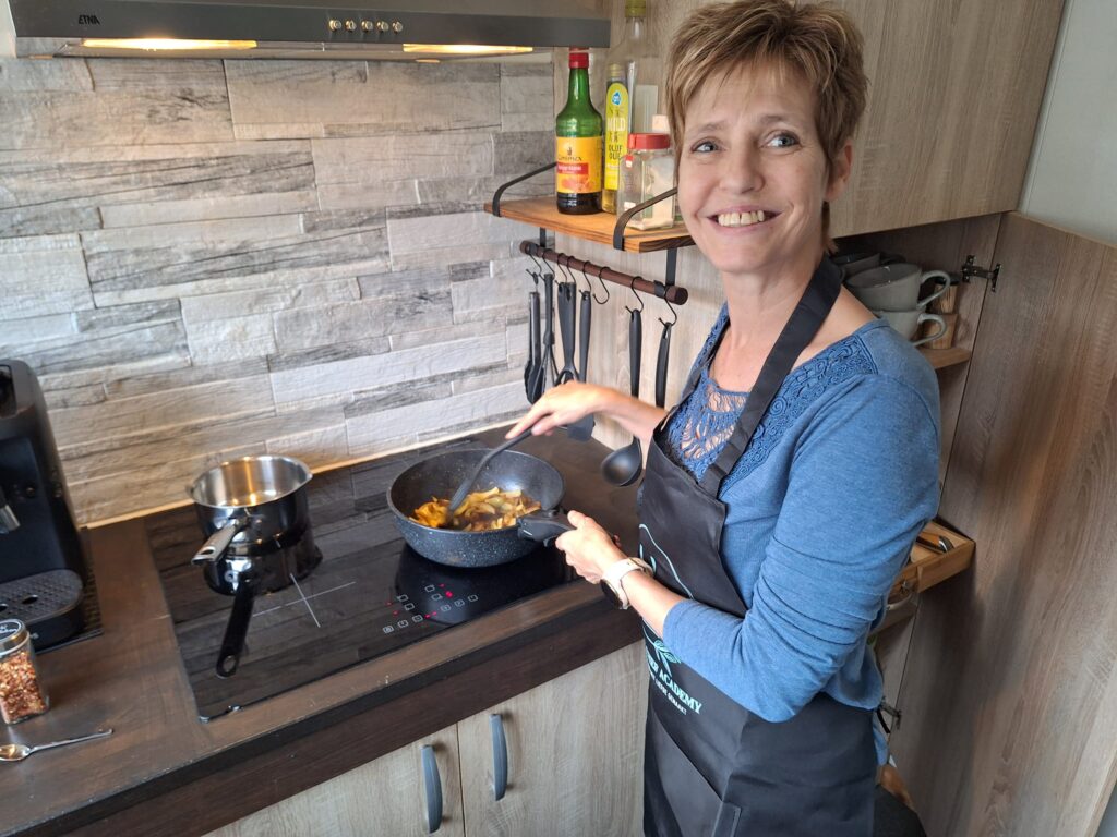 Haar eerste kennismaking was meteen een live kookweek. “Dat was echt een eyeopener. Vijf dagen lang samen koken om deze nieuwe gewoonte eigen te maken. Je krijgt duidelijke uitleg, kunt live meekijken met Jerry, en er zijn voorbereidingsvideo’s waarin je ook leert hoe je sneller en beter kunt snijden. Dat hielp me enorm.”