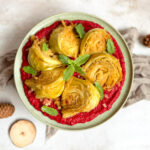 Smeer de hummus uit over het bord en top af met de kool, ui, granaatappel pitjes en hummus. Genieten!