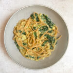 Proef dan de saus en breng eventueel extra op smaak met citroenrasp, oregano en/of bouillonpoeder. Als de smaak goed is, roer dan de spaghetti er doorheen en serveer met edelgistvlokken. Smullen!